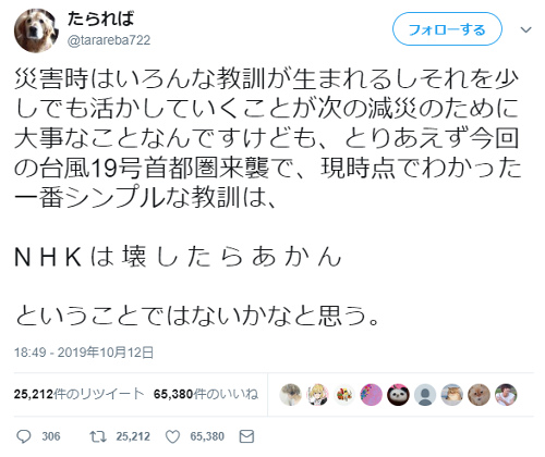 台風19号で Nhkは壊したらだめ Nhkは国民を守ってくれる というツイートが大拡散 ニコニコニュース